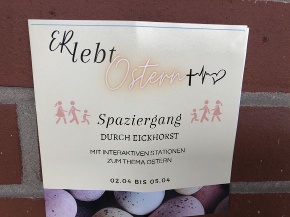„Ruhe, Zeit mit der Familie, frische Luft, Spiel, Spaß und Denkanstöße über das Alltagsgeschehen hinaus kannst du auf dem Osterspaziergang in Eickhorst erleben. Im Dorf sind interaktive Stationen für Jung und Alt aufgebaut. Entlang des Weges wird es für die Kinder spaßige Aktionen und eine Verlosung geben. An der 1. Station der Wassermühle liegen Laufzettel bereit, die entlang der Route begleiten. Einen Stift zum Malen und Schreiben bitten wir selbst mitzubringen.“