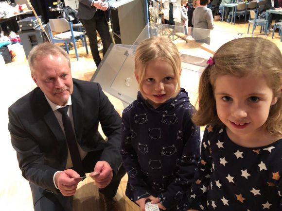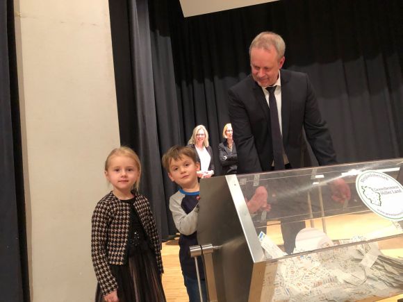 Beim zweiten Teil der Saalverlosung waren Sofia Romanowski und Tomte Dahl aus dem Johanniter-Kindergarten die Glücksbringer. Rechtsanwalt Burghard Günther erklärte den Kindern ihre Aufgaben.