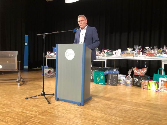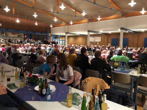 Mit Spannung wurde der erste Teil der Saalverlosung erwartet. Die Lostrommel und Tische mit geschmackvoll verpackten Geschenken waren auf der Bühne aufgebaut. Lena Franke und Pia Hauptmann aus dem ev. Kindergarten zogen die Gewinnkarten aus der Trommel. Uwe Wittemeyer las die Namen der Gewinner vor und fleißige Assistentinnen überreichten die Geschenke am Platz.