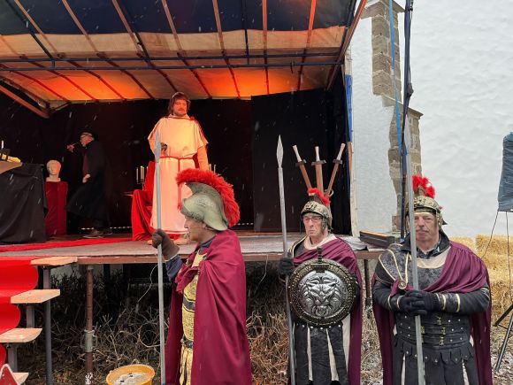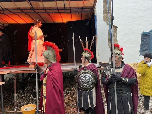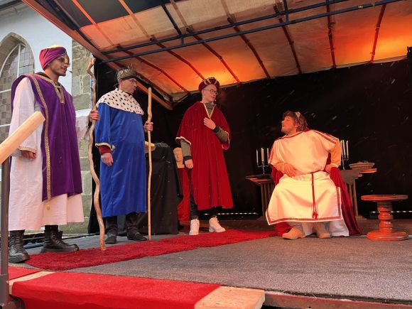 An der Nordseite der Hiller Kirche war eine Bühne aufgebaut worden, die den Rahmen für das Laienspiel bot. In dem Laienspiel wurden drei Ereignisse rund um die Geburt Jesu aufgeführt. Die zeitgenössischen Kostüme und die schauspielerischen Leistungen der Darsteller kamen bei den Zuschauern gut an.