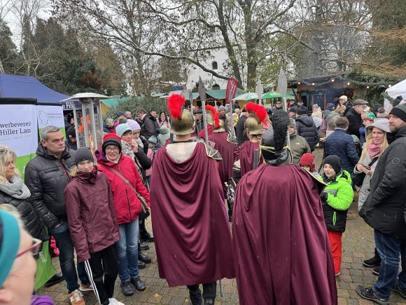 Die "römischen Soldaten" mischten sich auf dem Weg vom Gemeindehaus zur Bühne unter die Marktbesucherinnen und - besucher.
