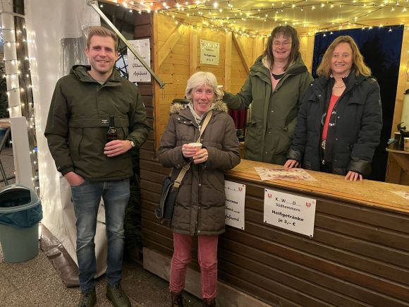Was wäre ein Weihnachtsmarkt ohne heiße Getränke? Zwei junge Damen bieten in der kleinen Hütte heißen Apfelsaft, Oevermann und Glühwein an. Oevermann ist ein Spezialgetränk des KWD. Es wird aus Weinbrand, heißem Apfelsaft und Zimt zubereitet. Der KWD ist nur an bestimmten Tagen geöffnet. Bitte Aushang beachten!