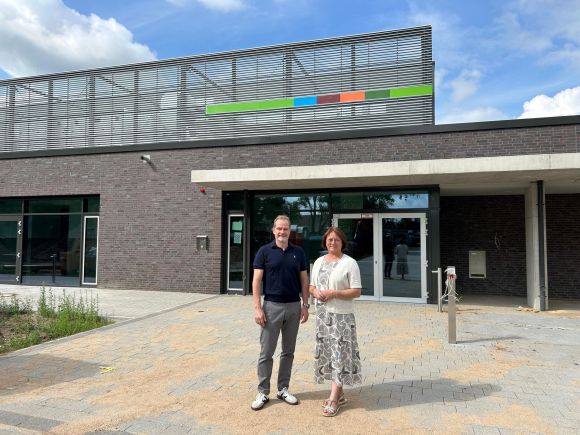 Bianca Winkelmann, MdL, und Bürgermeister Dirk Breves vor der WESER - HALLE in Petershagen