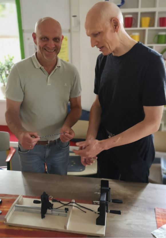 Der Produktentwickler Norbert Eigler hat eine kleine handliche Maschine konstruiert, mit der Kinder selbst anstelle von Seilen sich Freundschaftsbändchen anfertigen können. Der Leiter des Mühlenbauhofes Friedrich Rohlfing konnte sich vor Ort beim Tüftlertreff den Prototyp ansehen und selbst testen.