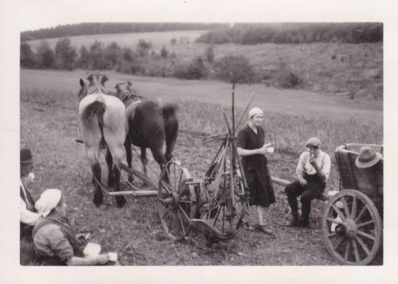 Aber auch das Arbeitsleben kam in dem Vortrag nicht zu kurz. Sei es der Arbeitsgang vom Mähen des Korns mit der Sense, dem Zusammenharken der Ähren, dem Binden der Gaben, hocken, Einfahren mit dem Leiterwagen und dem Dreschen mit der Dreschmaschine und dann der Wechsel über den Bindermäher zum Mähdrescher.