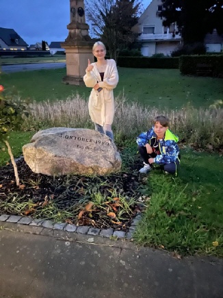 „Anna mit ihrer kleinen Schwester am Gedenkstein“