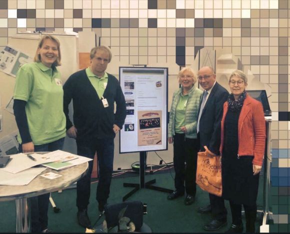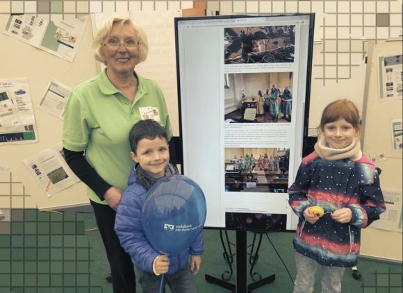 ... die Enkelkinder der 1. Vorsitzenden des HillerWebBlatts, als übernächste Generation an unseren Stand, vor dem Bildschirm, der einen Artikel zeigt, in dem diese in einem Musical mitspielen!