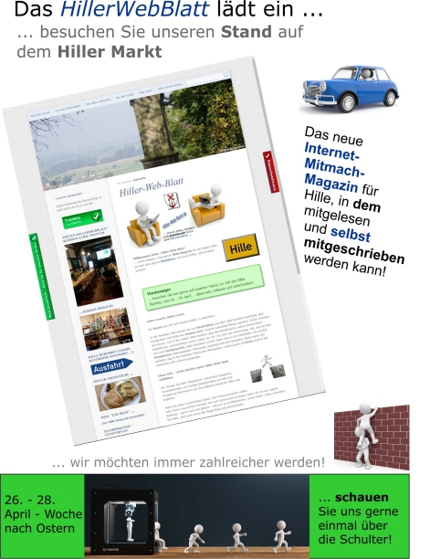 wer in diesen Tagen durch unsere Gemeinde Hille fährt, entdeckt an manchen Straßenrändern farbenfrohe Banner. Hier wird auf das HillerWebBlatt, ein Internetmagazin für Hille, hingewiesen und zum Mitmachen eingeladen.