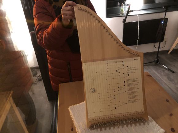 An jeden Mittwoch wird ein anderes Instrument eingesetzt, z.B. Klavier, Gitarre oder ein Blasinstrument. Am 09.12. bekamen die Gäste etwas Besonderes zu hören. Brigitte Harmening spielte auf einer Veen – Harfe. Im Gespräch mit dem HillerWebBlatt berichtete sie, dass der ungewöhnliche Name auf Hermann Veen zurückgeht. Er hatte das Instrument eigens für seinen behinderten Sohn gebaut. Die Veen-Harfe ist ein leises Instrument und zaubert schon vom Klang her eine festliche Stimmung.
