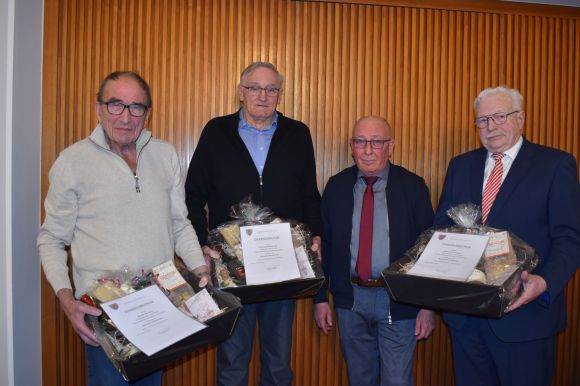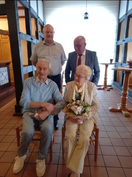 Die älteste Teilnehmerin und der älteste Teilnehmer dieser Feier wurden geehrt. Das waren in diesem Jahr Caroline Niermeyer und Wilfrid Niemeier.( sitzend v.l.) Ortsvorsteher Rolf Tiemann und Bürgermeister Michael Schweiß (stehend, v.l.) gratulierten mit einem Blumenstrauß und einem Präsent.
