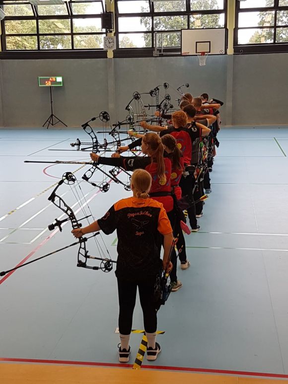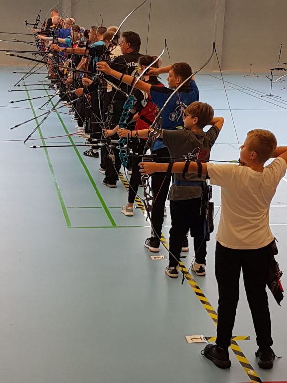Recurveschützen auf der Schießlinie, im Vordergrund die Schüler und Jugend