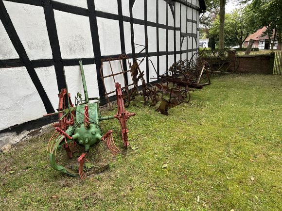 „Die landwirtschaftlichen Geräte, die hier gezeigt werden, haben uns die Bauern überlassen“, so Herman Böhne. Sie zeigen, wie die Bauern so in etwa um 1900 die Felder bestellten und die Ernte einbrachten. Am Beispiel der Mähmaschine führte der Vorsitzende aus, dass mit so einem Gerät das Getreide gemäht wurde, dann kam der Bindemäher auf und wurde in den 1950ziger Jahren durch dem Mähdrescher verdrängt.