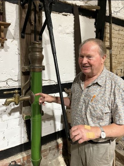 Hier stellt Hermann Böhne eine Handpumpe vor. Sie war für die Wasserversorgung auf den Höfen zuständig, als es noch keine Wasserleitungen gab,
