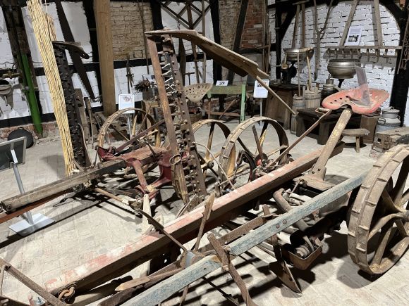 Als dann so ab 1950 der Trecker auf den Höfen Einzug hielt, wurden viele neue Landmaschinen entwickelt, die die schwere Arbeit erleichterten. Die Arbeitspferde, die bis dahin die treuen Helfer der Bauern waren, wurden nicht mehr gebraucht, die fortschreitende Technisierung vereinfachte die Arbeit auf den Höfen. Heute wird oft von der Technisierung der Landwirtschaft gesprochen. Die alten Geräte, die hier in der Museumsscheune zu sehen sind, zeigen, dass es früher mal ganz anders auf den Höfen zu ging, mehr Handarbeit und Muskelkraft gefordert wurde.