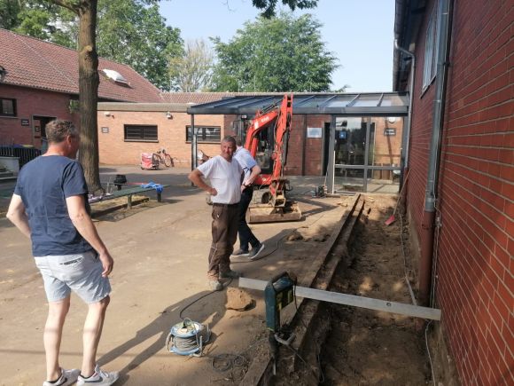 Hille-Holzhausen II. Seit Beginn dieser Woche tut sich was im Innenhof an der Bürgerhalle. Der Grünstreifen an der Außenwand der Halle (Südseite ), der nicht besonders gepflegt aussah, wurde abgetragen. Der Streifen wird gepflastert und es sollen da Sitzgelegenheiten aufgestellt werden. Diese Initiative hat der Förderverein Bürgerhalle ergriffen.