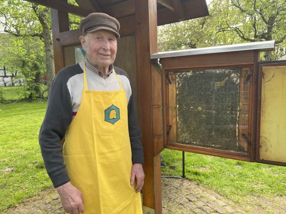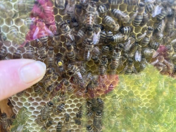 Imker Wilhelm Schumacher deutet auf die Königin (Biene mit weißem Punkt) hinhin