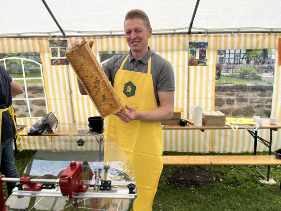 Besonders interessant war es am Stand des Imkervereins Rothenuffeln. Hier wurde der frische Honig geschleudert. Zunächst wurde Wachs von den Waben geschabt und danach schleuderte Imker Dimitri Pauls den Honig aus den Waben.