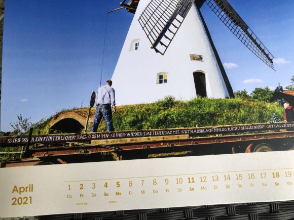 Auf dem Kalenderblatt für den Monat April wurden Historie und Gegenwart besonders gut eingefangen. Da ist ein renovierter Torbalken aus dem Jahre 1818 zu sehen mit der Inschrift: „Dies war ein fürchterlicher Tag – seh ihn keiner wieder – das Feuer, das mit Wut ausbrach - schlug plötzlich alles nieder – Gott allein die Ehre“. Diese Aussage „Gott allein die Ehre“ hatte 1818 sicher eine große Bedeutung, man hätte sie sonst nicht in den Balken geschnitzt und sie wird uns sicher auch heute und morgen etwas zu sagen haben.
