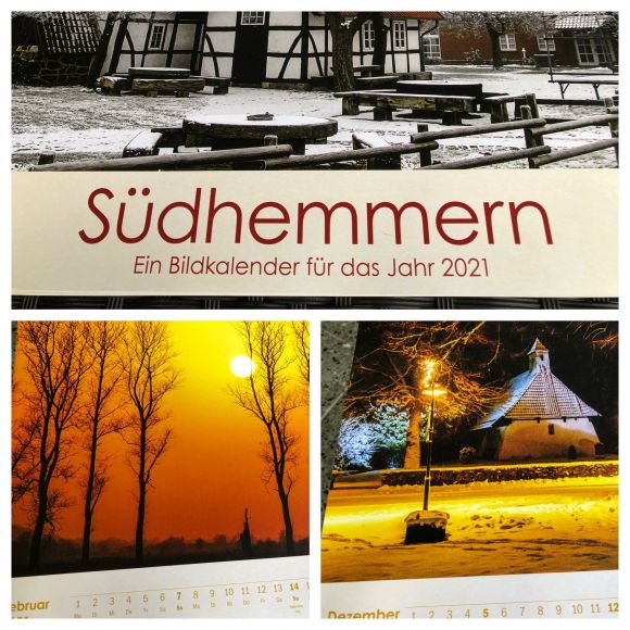 Der diesjährige Kalender des Heimatvereins Südhemmern zeigt vielfältige Facetten des Dorfes. Er verbindet gelebte Vergangenheit und Zukunft. Die Mühlengruppe, die mit zwei Männern aktiv die Segel der Windmühle einholt oder der Kindergarten mit seinem Kieselsteinmenschenbrett -harmonisch mit bunten Blumen auf dem Zaun inszeniert in sommerlicher Farbenpracht - alternativ hierzu ein Blick in die Weite: das winterliche Moor mit seinen Bastauwiesen. Die Moderne versteckt hinter einer schnaufenden Dampflock. Es gibt ihn noch in Südhemmern einen aus der Mode gekommenen Misthaufen, gepflegt sichtbar im Ortseingang. Landschaftssaufnahmen der bäuerlichen Aussaat im Moor, eines alten Backhauses - in Herbstlaub gehüllt oder der Kanal in der Abendstimmung. Der Kalender präsentiert ein lebendiges Dorf.