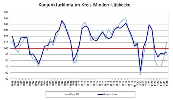 Das Konjunkturklima in Minden-Lübbecke mit 83 Punkten ist aktuell nur geringfügig besser als der Tiefstand in der damaligen Immobilien- und Finanzkrise 2008/2009.Die 100er-Linie steht für eine ausgeglichene Stimmung, bei der sich Optimisten und Pessimisten die Waage halten.