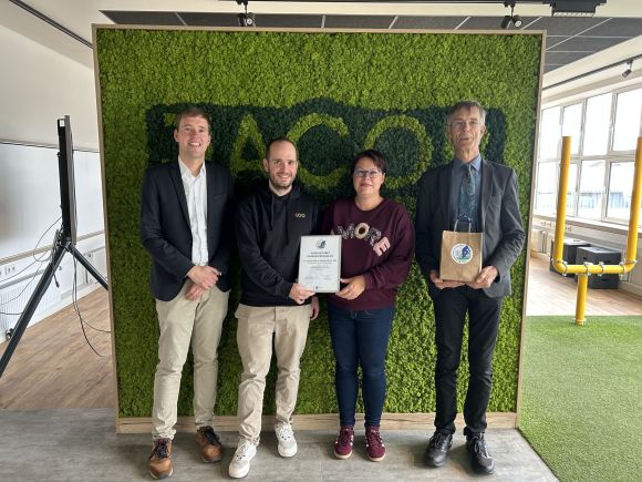 IHK-Siegel „Ausgezeichnet Fahrradfreundlich“ erstmals für ein Unternehmen im Kreis Minden-Lübbecke verliehen: Head of Finance Meike Stemme (2. v. l.) und Director Finance & Controlling Jonas Pfannschmidt (2. v. r.) haben für das Unternehmen Fr. Jacob Söhne von IHK-Geschäftsführer Karl-Ernst Hunting (r.) und IHK-Referent Manuel Kauf (l.) die entsprechende Urkunde erhalten. Foto: Fr. Jacob Söhne GmbH & Co. KG
