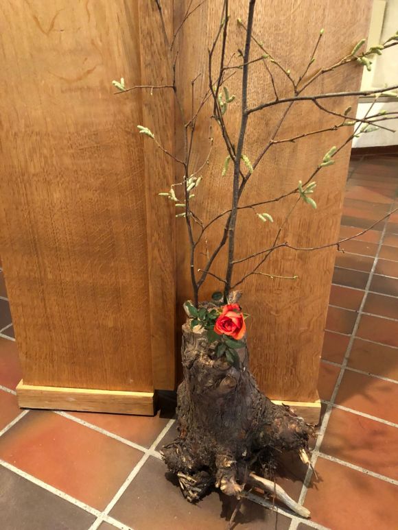 Pfarrer Wilmsmeier, der den Gottesdienst hielt, stellte eine Baumwurzel vor. Sie sei zwar nur ein Teil eines Baumes, aber ein sehr wichtiger, denn ohne Wurzel könne der Baum nicht wachsen und gedeihen. Aus dieser knorrigen Baumwurzel schaute aber auch ein zartes Röslein und ein Zweig mit vielen Knospen hervor.