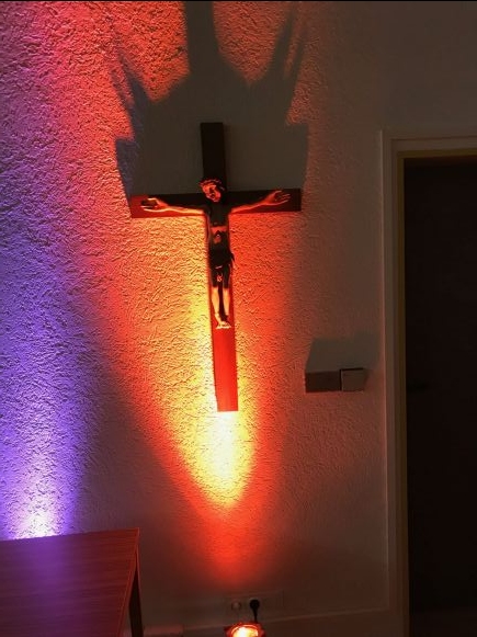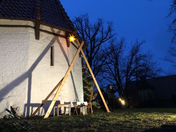 Im Eingangsbereich der Kirche wurden die Besucherinnen und Besucher mit einem Plakat und mit der Bitte um Stille empfangen. Eine Lichtillumination, die der Prädikant erstellt hatte, tauchte das Kirchenschiff in warme Rottöne und verbreitete eine Wohlfühlatmosphäre.