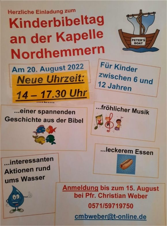Holzhausen-Nordhemmern. Das Kindergottesdienstteam Holzhausen Nordhemmern lädt die Kinder von 6 bis 12 Jahren zum Kinderbibeltag ein. Er findet am Samstag, den 20. August an der Kapelle in Nordhemmern und im Spritzenhaus statt. Die Kinder können eine spannende Geschichte aus der Bibel kennenlernen, Experimente machen, miteinander spielen und gemeinsam essen. Am Samstag geht es um 14.00 Uhr los und um 17.30 Uhr können die Kinder wieder abgeholt werden. Für leckeres Essen und kalte Getränke wird bestens gesorgt. Anmeldungen erbeten bei Pfr. Weber unter cmbweber@t-online.de