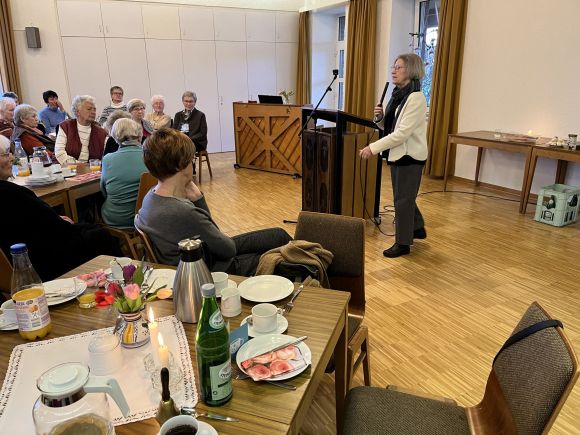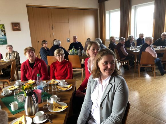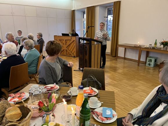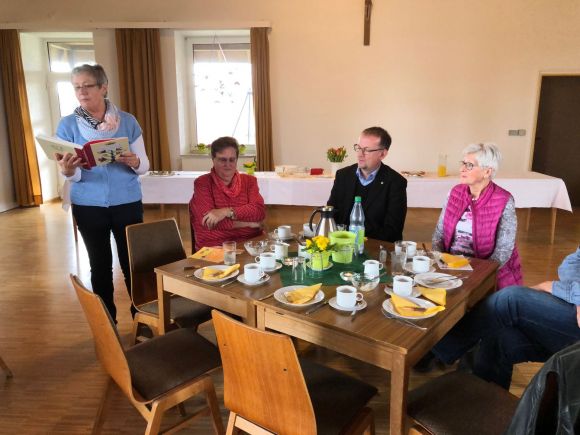 Zu Beginn hat Johanna Gartmann die Gäste mit einem Guten-Morgen-Lied eingestimmt. Heidrun Schlotzhauer begrüßte die Gäste im gut besuchten Gemeindesaal. Sie bedankte sich bei dem Vorbereitungsteam für die schöne Gestaltung des Vormittags. Nach einem dreistimmigen Kanon konnten alle das reichhaltige Frühstück genießen. Um fit zu bleiben brachte uns Johanna Gartmann mit Gymnastik in Schwung.