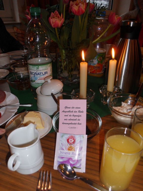 Nach dem reichhaltigen und gemütlichen Frühstück hat uns Johanna mit ihrer "kleinen" Verstärkung erstmal in Bewegung gebracht. Nach wohltuender Morgengymnastik hat die Referentin Karin Krudup, die in Nordhemmern geboren und aufgewachsen ist, über Achtsamkeit berichtet und wie wir diese im Alltag leben können.