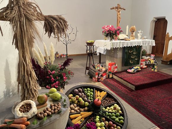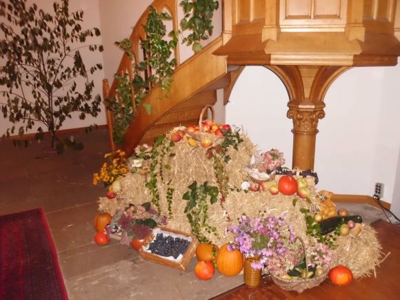 Wie schon in den anderen Jahren war der Altarraum mit Obst, Gemüse und Blumen geschmackvoll geschmückt. Schon der Anblick regte zum Dank für die reiche Ernte an.