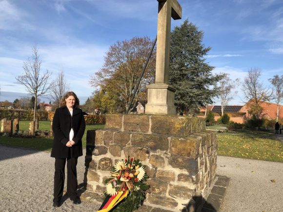 Nach der Andacht legten Ortsvorsteherin Kirsten Gardini und Pfarrer Christian Weber einen Kranz am großen Kreuz auf dem Holzhauser Friedhofs nieder. Später wurde er an seinem angedachten Platz, am Holzhauser Ehrenmal an der Minderheiderstraße, niedergelegt.