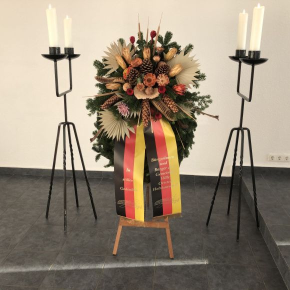 Die Gemeinde Hille hatte einem Kranz in der Friedhofskapelle aufstellen lassen. Auf den Schleifen war zu lesen: „ In stillen Gedenken – Bürgerinnen und Bürger der Gemeinde Hille Ortsteil Holzhausen II“.