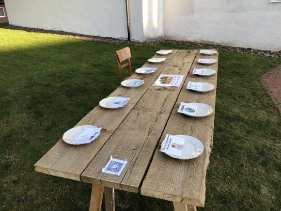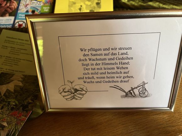 Auf jedem Tisch stand ein Kärtchen mit einer Strophe des Liedes von Matthias Claudius „Wir pflügen und wir streuen den Samen auf das Land, doch Wachstum und Gedeihen steht in des Himmels Hand“. Dieser Text passte besonders gut zum Erntedankfest und konnte von den Gästen gedanklich mit in die neue Woche genommen werden.