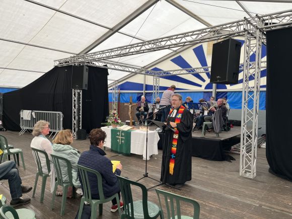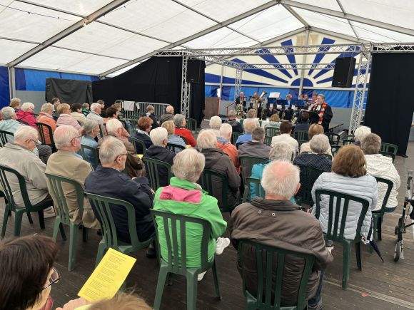 Hille-Nordhemmern. Der TVG Nordhemmern und die Ev. Kirchengemeinde hatten am Sonntagvormittag (03.08.2025) zu einem Gottesdienst in das Festzelt auf dem Sportplatz eingeladen. Friedhelm Prothmann begrüßte im Namen des TVG die Besucherinnen und Besucher und sagte in seiner humorvollen Art und mit Blick auf das kühle, regnerische Wetter, dass das nächste Sportfest wieder im Sommer stattfinden soll.