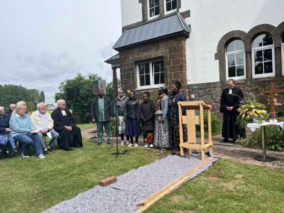 Auf dem Rasen im Pfarrgarten waren Sitzbänke aufgestellt und vor dem bunten Blumenbeet mit Klatschmohn, Rosen und Fingerhüten stand der Altar. Es hatten sich rund 150 Gäste (geschätzt) eingefunden. Für die Kinder wurde ein separater Kindergottesdienst angeboten. Die Posaunenchöre der Kirchengemeinden sorgten für den musikalischen Rahmen. Ein kleiner Chor aus Tansania bereicherte den Gottesdienst mit einem Lied in der Landesprache.