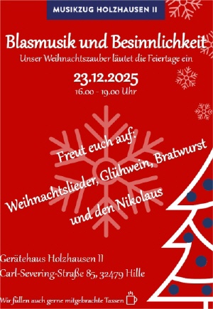 Hille- Holzhausen II. Der Feuerwehrmusikzug Holzhausen II lädt am 23.12.2024 in der Zeit von 16:00 bis 19:00 Uhr in das Feuerwehrgerätehaus in Holzhausen II, an der Carl - Severing - Straße 85 ein. Dann ist in den Räumen der Feuerwehr Weihnachtszauber angesagt.