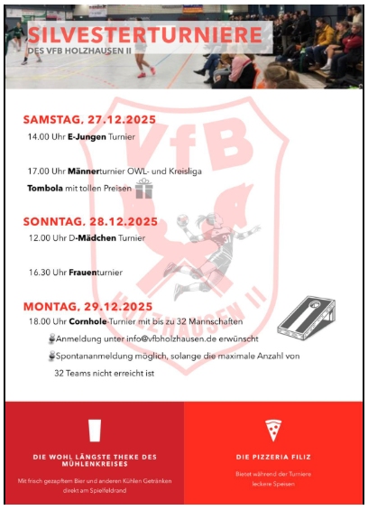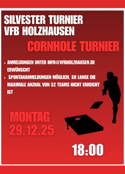 ... vom 27.12. bis zum 29.12.2024 veranstaltet der VfB Holzhausen wieder Silvesterturniere. Das Programm habe ich als Anlage beigefügt. Besonders möchte ich an dieser Stelle auf die "Cornhole-Challenge" aufmerksam machen. Cornhole erfreut sich immer größerer Beliebtheit und ist ein Geschicklichkeitsspiel für jung und alt. Wie spiele ich Cornhole: https://www.youtube.com/watch?v=vzk5-d7DATc