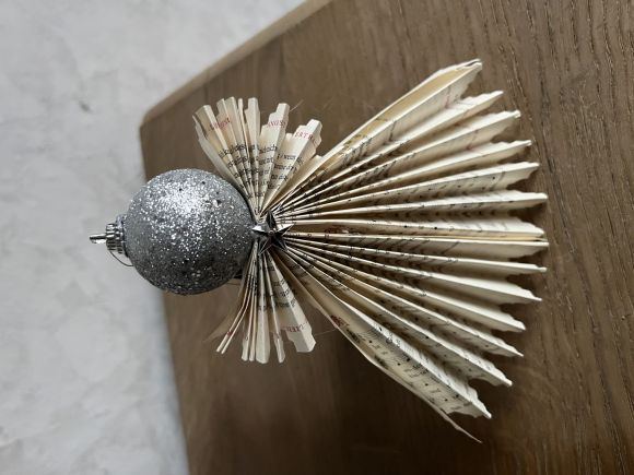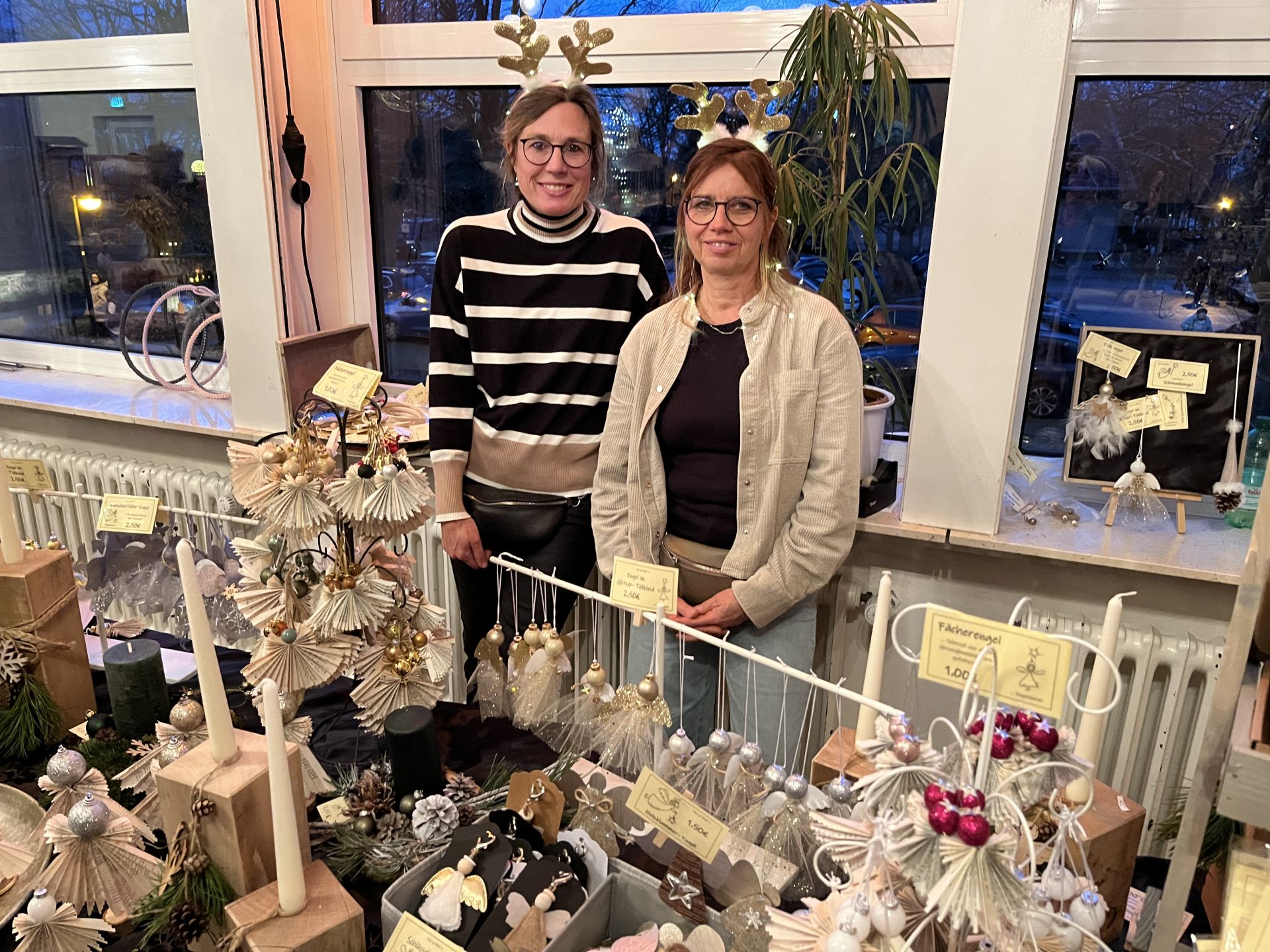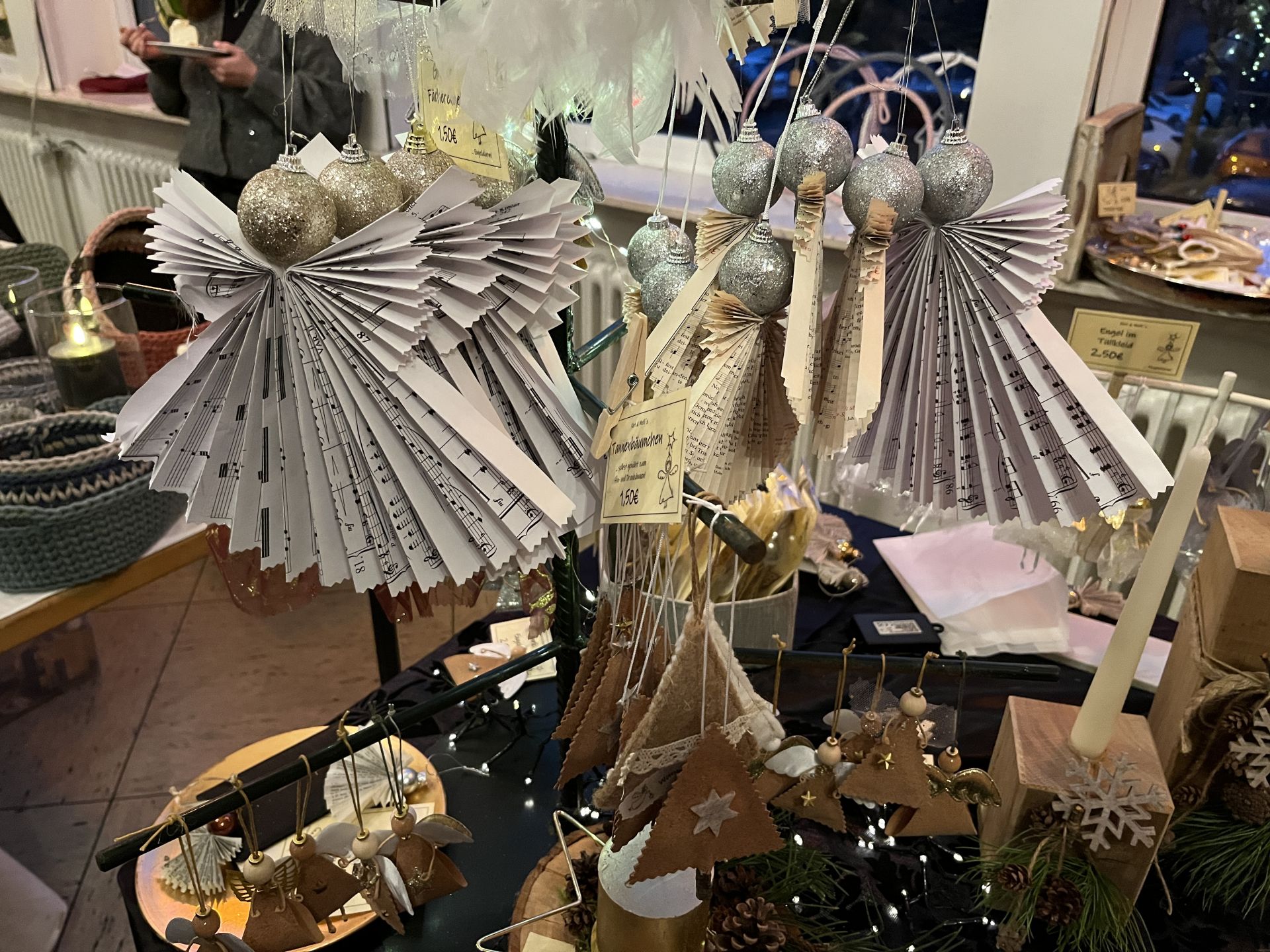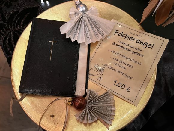 Kori und Melli, zwei junge Damen aus Haddenhausen und Rothenuffeln, boten jede Menge Engel in verschiedenen Variationen an. Sie hatten die Idee, aus alten Gesangbuchseiten Engel zu falten. Sie wurden in verschiedenen Größen hergestellt, mal stehend und mal hängend. Die alten Gesangbücher hatten ihre Omas, Bekannte und Verwandte bereitgestellt. Auch Kunden der Bäckerei Kleine hatten alte Gesangbücher für die Engelproduktion im Laden abgegeben.