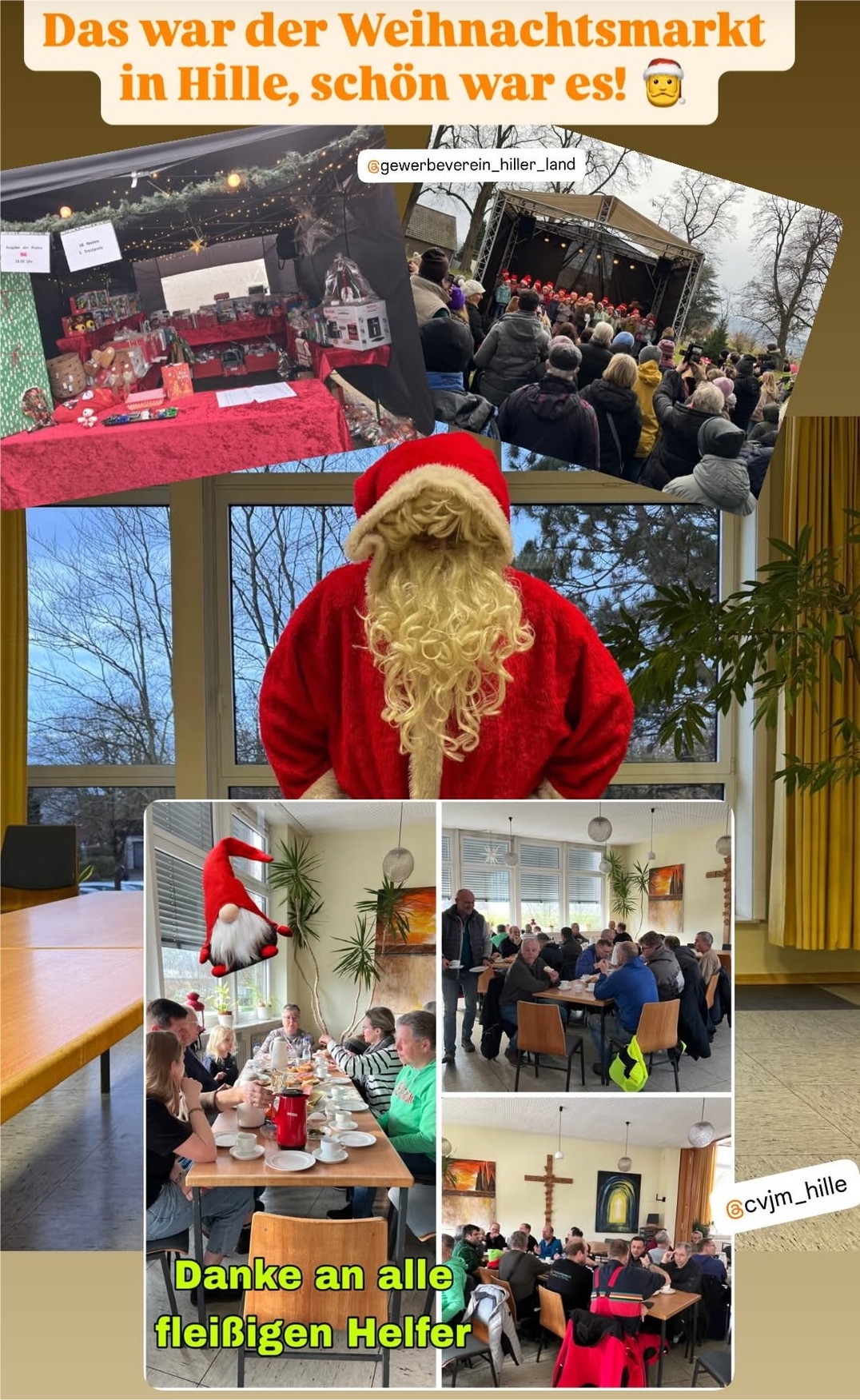 Der Gewerbeverein hatte mit vielen fleißigen Helfer die Vorbereitungen getroffen, etliche Buden aufgebaut, mit Lichterketten und weihnachtlichem Ambiente geschmückt. Zahlreiche Gruppen, Vereine und Organisationen, wie z.B. die Feuerwehr, der SC Hille, der Fanclub Schalke 04, Fördervereine der Hiller Schulen, der Kindergärten und Geschäftsleute waren auf dem Marktgelände vertreten.