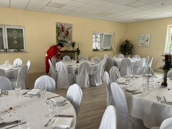 Hier werden die letzten Vorbereitungen für das Mitarbeiterfest getroffen