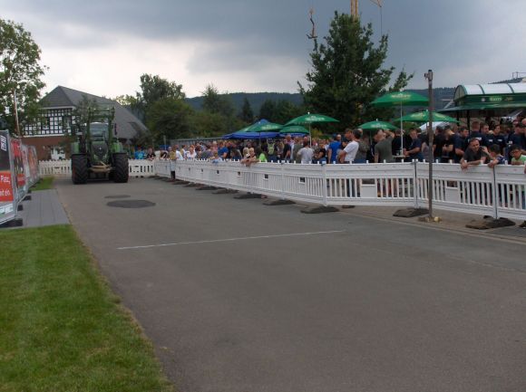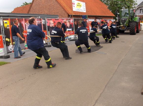 Bei dem Wettbewerb galt es, einen schweren Fendt-Trecker (220 PS und( 7,5 Tonnen schwer) mit einem dicken Tau in möglichst kurzer Zeit über die Ziellinie zu ziehen. Die Strecke war 20 Meter lang und entsprach exakt einer B – Schlauchlänge, das ist bei der Feuerwehr ein bekanntes Maas.