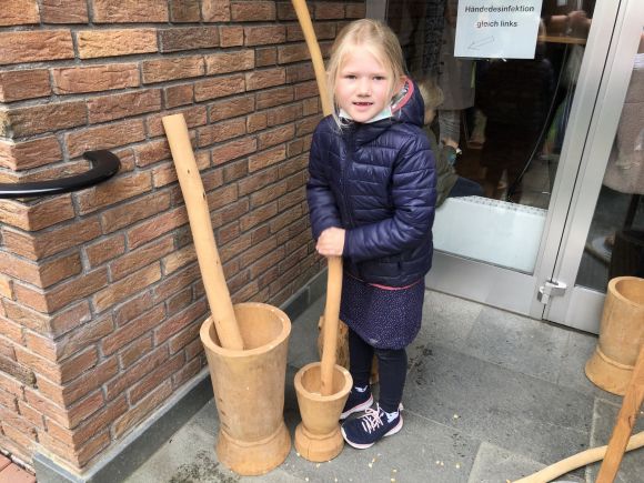 Für die Kinder waren Spiele und Rätsel vorbereitet. Sie konnten in original afrikanischen Holzgefäßen ausprobieren, wie mühsam das Zerstampfen der Maiskörner ist. Nur aus zerstampfen Körnern kann der bekannte Maisbrei zubereitet werden.
