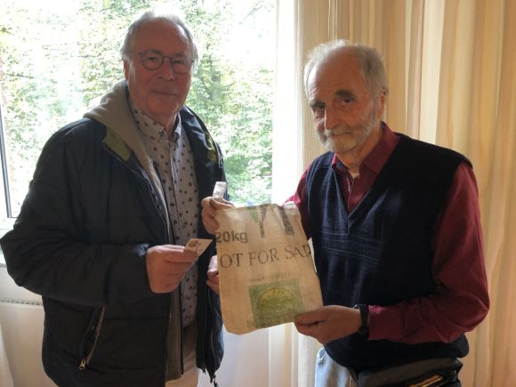 Die Vorstandsmitglieder Heinz-Walter Höltkemeier und Dr. Jan Pferdemenges stellten die Schultasche vor, die aus den leeren Maissäcken angefertigt wurde. (v.l.)
