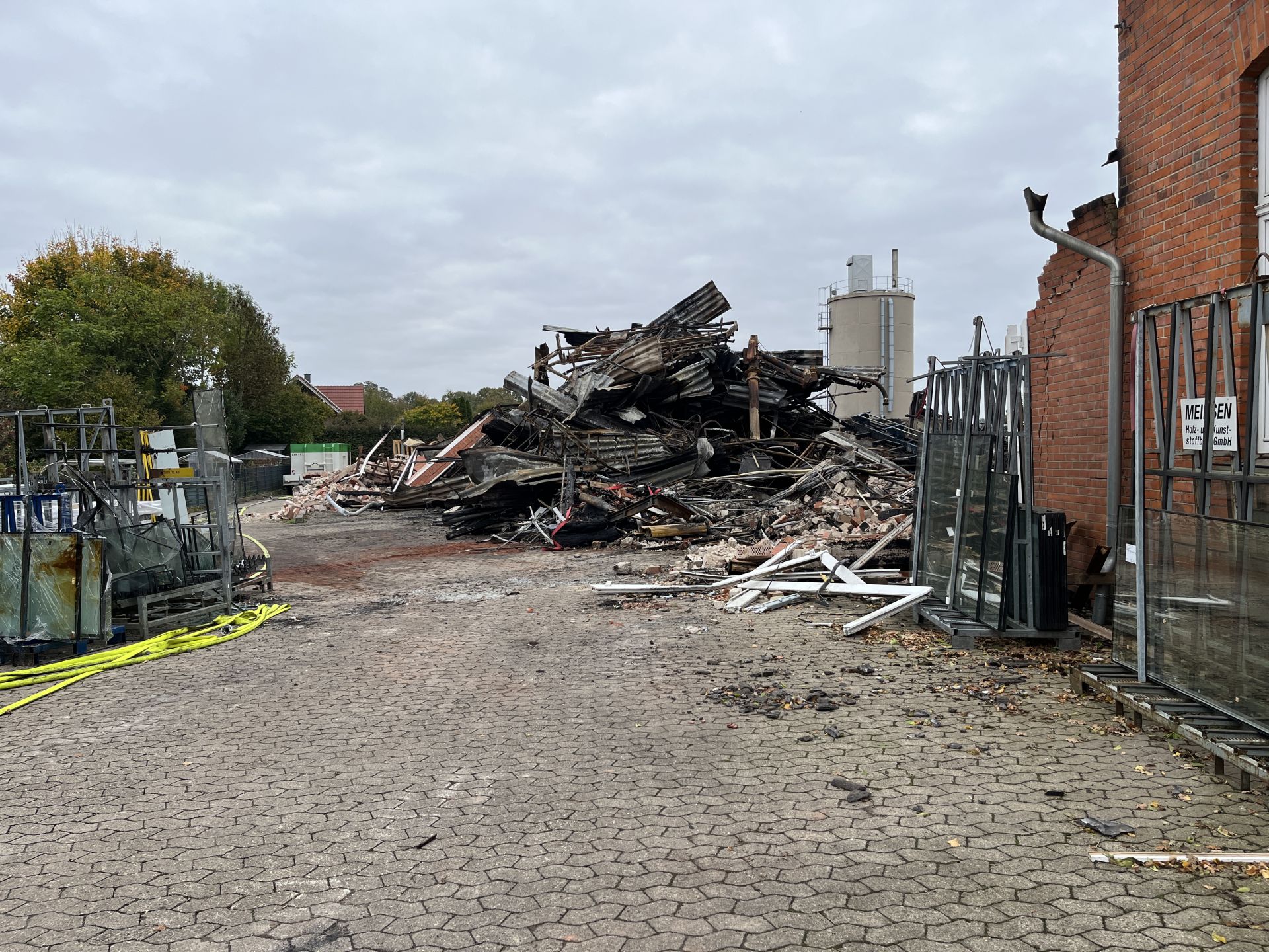 Hille-Holzhausen II. Wo am Mittwoch noch Fenster und Türen hergestellt wurden, sieht man heute (Freitag, 10.10. 2025) nur noch Trümmer und Brandreste. Die Fertigungs- und Lagerhalle des Betriebes wurden in der Nacht durch ein Großfeuer völlig zerstört.