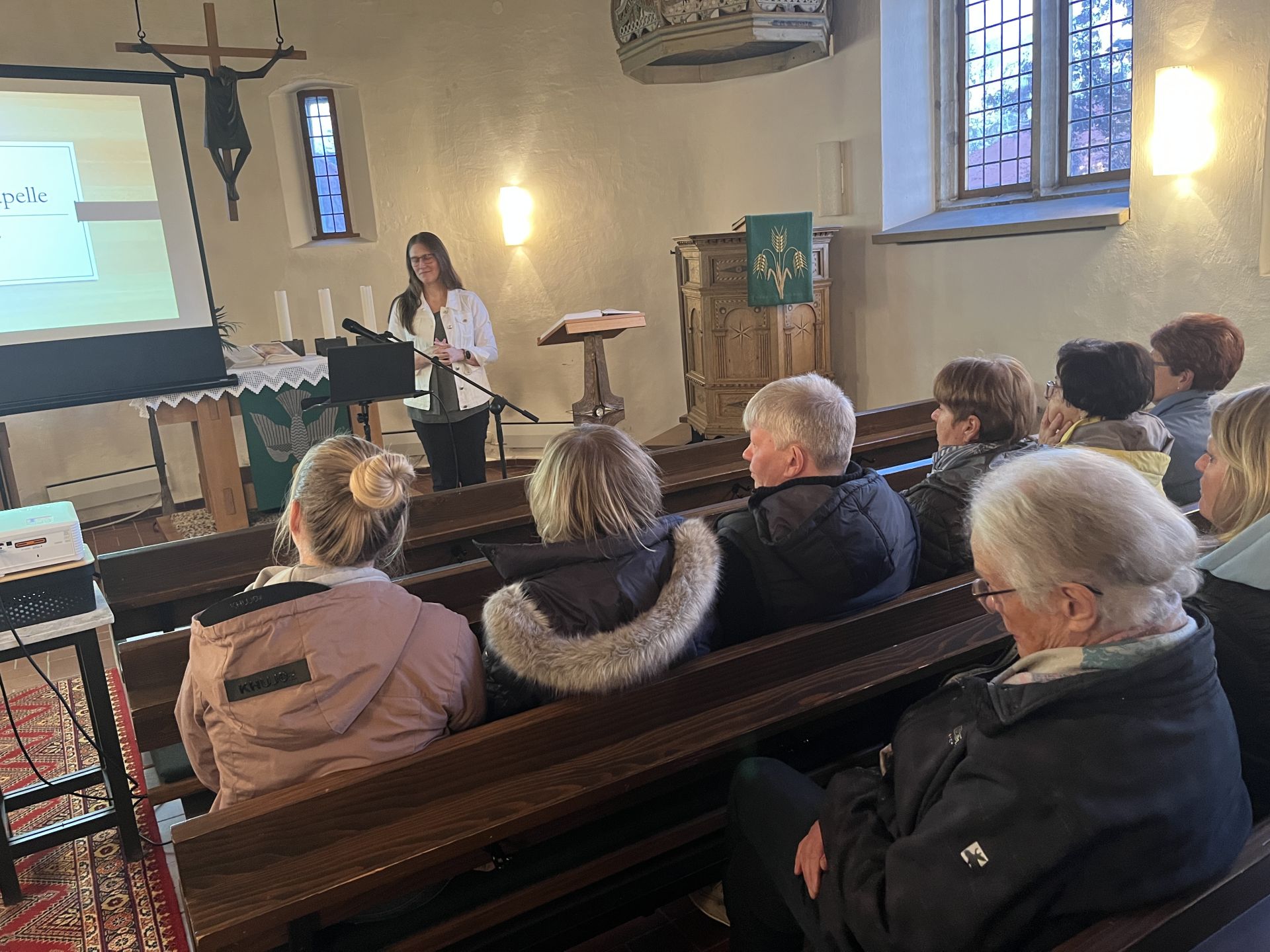 Der Dorfspaziergang führte zuerst zur Kapelle. Pastor Weber stellte die Besonderheiten im Innenraum der Kapelle vor. Sie soll im 13. Jahrhundert erbaut worden sein und diente früher als Gotteshaus und Wehrkirche.