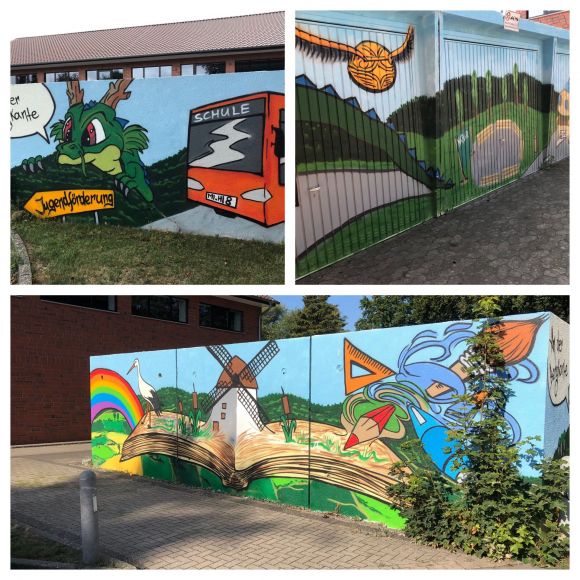 Einige Bürgerinnen und Bürger verbinden mit Graffiti überwiegend „Wände beschmieren und hohe Reinigungskostens“, hier wurden nun schöne Bilder geschaffen, die dem Parkplatz an der Grundschule einen freundlichen Anblick verleihen.