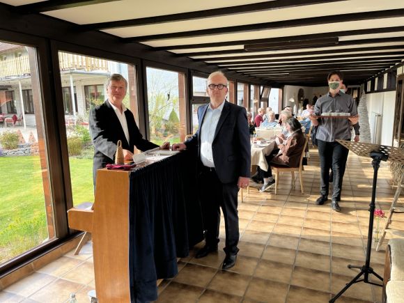 Der Liedernachmittag stand unter dem Motto „Feelin Groovy“. Peter Krudup, Bass-Bariton aus Bielefeld, wurde von Dieter Nowak am Klavier begleitet. Die beiden Künstler sind nicht das erste mal im Kurhaus aufgetreten, sie haben auch im letzten Sommer auf der Terrasse des Kurhauses einen Liedernachmittag gestaltet. In den Pausen hatten sich die Gäste viel zu erzählen, denn einige sahen sich coronabedingt erst nach langer Zeit wieder.