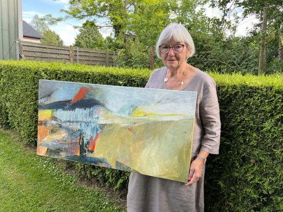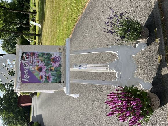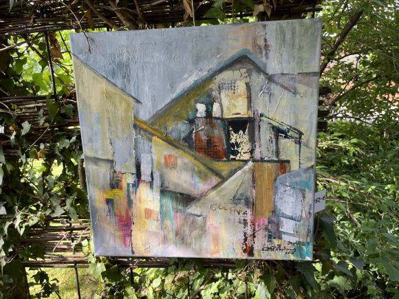 Auch Kunstfreunde kamen beim Besuch dieses Gartens auf ihre Kosten. Wie schon in den anderen Jahren stellte die Künstlerin Doris Büsching aus Bad Oeynhausen einige ihrer Werke aus. Es handelte sich um abstrakte Bilder, Acryl auf Leinwand. Die Gäste waren begeistert und man konnte den Gesprächen entnehmen:“ Kunst und Blumen, eine gelungene Kombination“.