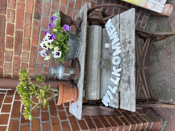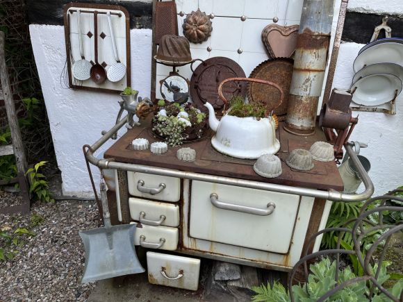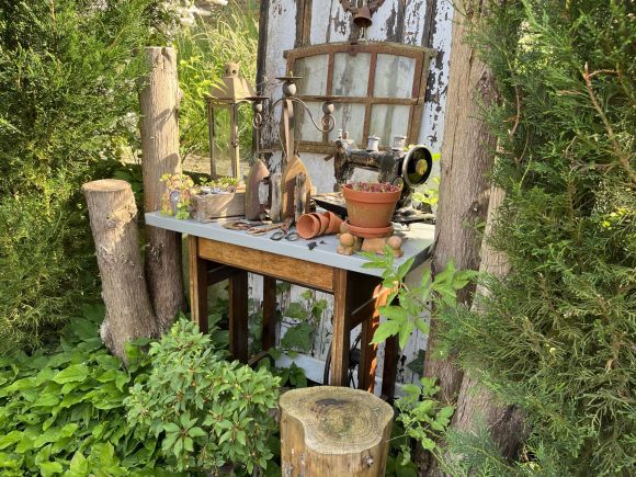 Zwischen den Pflanzen stehen auch immer wieder kleine Überraschungen. Es sind zum Teil alte gebrauchte Haushaltsgegenstände, wie z.B. eine Nähmaschine, verschiedene Kuchenformen oder Gießkannen aus Zink. Ute Böhne hat sie liebevoll mit Blumen und Sukkulenten dekoriert und so erscheinen die gebrauchten Gegenstände aus früheren Zeiten im neuen Licht.